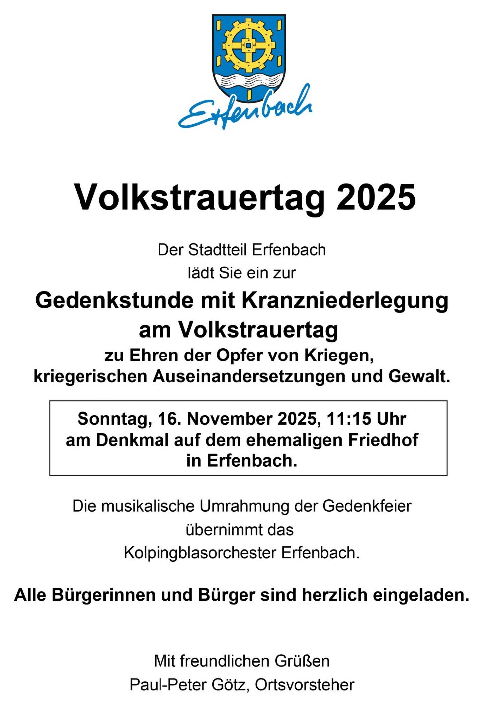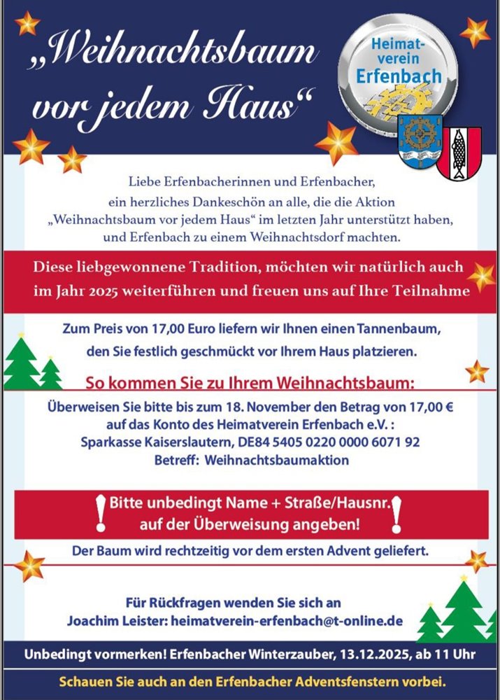 An dieser Stelle biete ich die Möglichkeit Ankündigungen für aktuelle Veranstaltungen, Termine usw., die Erfenbach betreffen, hier zu präsentieren. Wenn Sie möchten, setzen sie sich bitte mit mir wegen eines Eintrags in Verbindung.